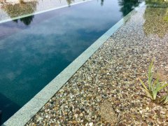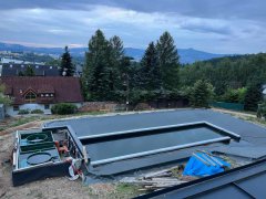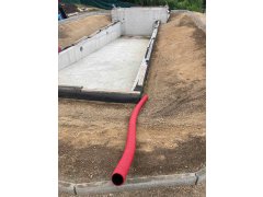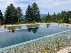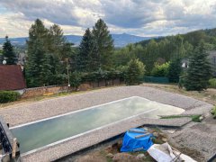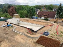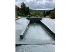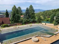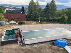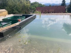 Toto koupací jezírko v Liberci jsme stavěli na dálku. Majitel si sám i vzhledem ke vzdálenosti od nás, stavěl a fólioval svépomocí. Jen pod naším dohledem, vše jsme řešili radami po telefonu a emailu. Letos na jaře zabudoval na dno jezírka spodní vpusti - gule a do stěny technické místnosti fóliové příruby pro skimmery Oase Aquaskim Gravity. A také natáhl flexi hadice 63mm na výtok čisté vody z technické místnosti zpět do jezírka. V létě jsme mu dodávali jezírkovou fólii Fatra Aquaplast 805/V olivově zelenou a speciální fóliové lišty. Po dokončení těchto prací jsme již mohli přijet a zapojit technologii. Přivezli jsme 2 ks biologicko-mechanického filtru Tripond Vortex-Center C115, k němu jsme zapojili 4 ks UV lampy TMC Pro Pond Titan 110W. Vodu zpět do jezírka tlačí 2 ks čerpadel Oase AquaMax Gravity 20000. Dokončení jezírka si již majitel realizoval opět sám. K udržení čisté vody a fólie jsme doporučili pravidelně používat bazénový robotický vysavač.