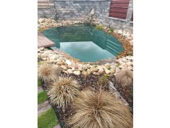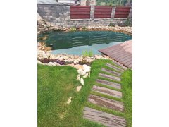 Hned na to se začalo s pokládkou fólie, nejdříve se položila geotextílie 500g a na ní se začala pokládat fólie Fatra Aquaplast 805/V olivově zelená. Po vyfóliování a napuštění vody se připojila technologie. Jezírko má obsah kolem 28m3, vybrali jsme filtr Oase BioTec ScreenMatic 2 145000 na něj se napojila UV lampa TMC Pro Pond Advantage 110W. Čerpadla se použila 2, jedno systémové AquaForte O-series 13000 a jedno na efekt AquaForte O-series 10000. Klienti si poté již jezírko dodělají sami, vyskládají kameny a vysází květiny.