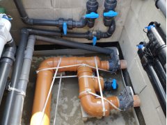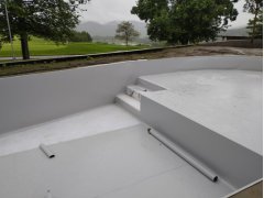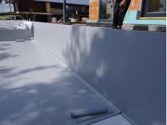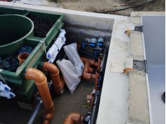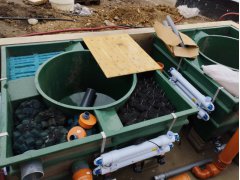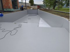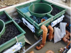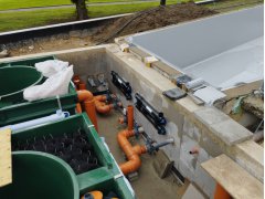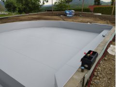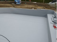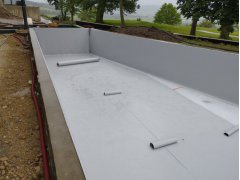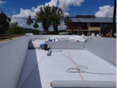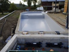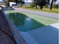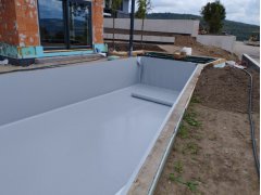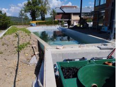 Stavba tohoto jezírka nás bavila i přes to, že byla velmi náročná. Od začátku jsme s klientem konzultovali stavbu krok za krokem. Vzhledem k tomu, že stavba probíhala současně s dostavbou rodinného domu si klient stavební práce realizoval sám. Naši technici na stavbě provedli jen pokládku gulí, stěnových skimmerů Oase ProfiSkimm Wall 100, na výtok čisté vody z filtru natáhli flexi hadice 63mm k fóliovým přírubám 63mm. Zbytek stavby provedli zedníci. Po dokončení stavebních úprav nastala naše práce….připevnit speciální fóliové lišty, na ně geotextílii 500g a poté začít s pokládkou fólie Vedag Morganplan. Klient si vzhledem k novostavbě a modernímu stylu domu vybral světle šedou fólii. Po napuštění jezírka vodou jsme zapojili technologii. Opět jsme doporučili náš oblíbený biologicko-mechanický filtr Tripond Center-Vortex C115, vzhledem k velikosti jezírka 2 kusy, na ně jsme pověsili UV lampy TMC Pro Pond Advantage 110W 4 kusy a po konzultaci s majitelem a také, vzhledem k velmi teplému počasí v posledních letech jsme doporučili na přídavný systém dát 2 UV lampy TMC Pro Pond Titan 110W, čerpadla Oase AquaMax Gravity 20000 2 kusy a Oase Aquamax Eco Titanium 31000. Tento systém zajistí krásnou vodu bez starostí po celý rok.