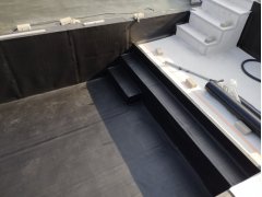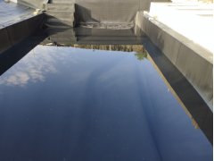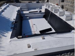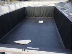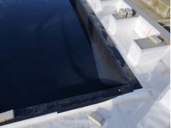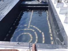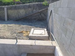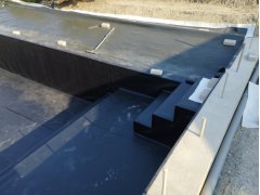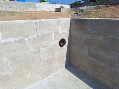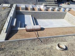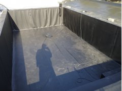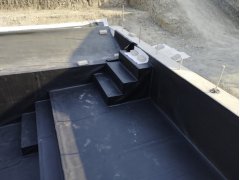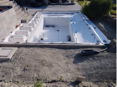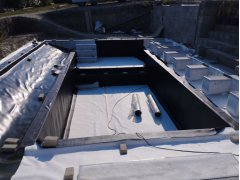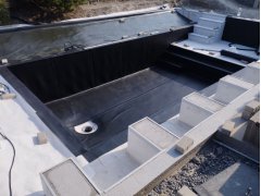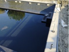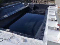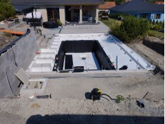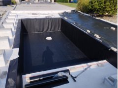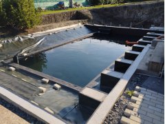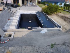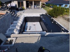 Plánování a realizace tohoto koupacího jezírka nás velmi bavila. Požadavek na černou jezírkovou fólii a antracitovou kamínkovou fólii naznačoval netypický výsledek. Po pečlivém plánování, zvažování možností a hlavně přání postavit jezírko co nejdříve se opět zvolila varianta spolupráce s klientem na stavbě. Klient si svépomocí vybagroval hloubku a tvar jezírka, ze ztraceného bednění postavil základy. Na dno jezírka zabetonoval spodní vpusť- gulu a do jedné stěny fóliovou přírubu pro skimmer Oase AquaSkim Gravity, od nich natáhl potrubí do čerpadlové šachty. Následně dno jezírka pokryl betonem. Po dokončení všech přípravných prací mohli naši technici přijet jezírko vyfóliovat. Nejprve se musela položit geotextílie 500g a na ní, na ostré hrany navrtat speciální fóliová lišta na ně se následně začala navařovat černá jezírková fólie (pouze na objednávku). Práce byli trochu jiné než obvykle, protože klient si v pobřežní zóně vytvořil několik soklů, které se museli ze všech stran pokrýt fólií. Tento prvek bude po napuštění jezírka krásný a hlavně netradiční. Po vyfóliování si již klient sám na pobřežní zóny nalepil protiskluzovou kamínkovou černou fólii. A začal napouštět vodu. Mezi tím technici začali připojovat technologii. Protože dispozice pozemku neumožňuje položit filtr do těsné blízkosti jezírka zvolili jsme gravitační systém do čerpadlové šachty a z ní potom saje čerpadlo AquaForte O-series 16000 vodu do mechanicko-biologického filtru Tripond Center-Vortex C80, který je postavený několik metrů od jezírka tak, aby nebyl vidět a nekazil ráz zahrady. Na Filtr jsme pověsili na nerezových držákách 2 kusy UV lamp TMC Pro Pond Advantage 110W. Voda z filtru do jezírka jde již samospádem. K udržení čistého dna bez usazenin vždy doporučujeme robotický vysavač např. Zodiac RA 63 iQ Bio