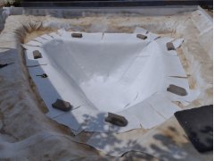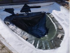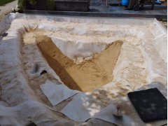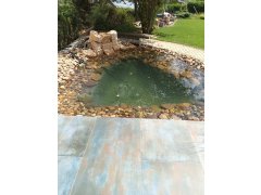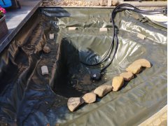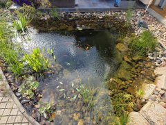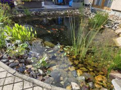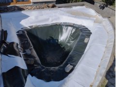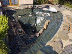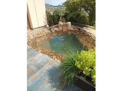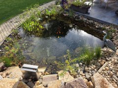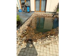 Toto jezírko je krásná ukázka toho, jak pěkné může být malé jezírko s hobby technologií. Klient nás oslovil s tím, že má u terasy prázdné rohové místo, kde by se mu líbilo malé okrasné jezírko. Dle návrhu se ručně vykopal tvar jezírka, vytvarovali se menší pobřežní zóny, dno se pokrylo kopaným pískem a na písek se pak položila geotextílie 500g a na ní se začala pokládat jezírková fólie Fatra Aquaplast 805/V olivově zelená. Po položení fólie se na dno jezírka položilo čerpadlo Oase AquaMax Eco Classic 14500, to se napojilo na tlakový filtr Oase FiltoClear 31000. Tento typ filtrace lze ze 2/3 zakopat a vrchní díl schovat krycím kamenem Oase FiltoCap. Zakončení jezírka jako položení kamenů osazení květinami si již klienti udělali sami. Později ještě připojili do rohu jezírka malý nerezový efekt Oase WaterFall Kit 30 a k němu čerpadlo Oase AquaMax Eco Classic 3500. Po dokončení všech prací osadili jezírko Koi kapry.