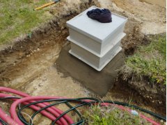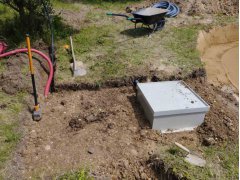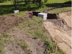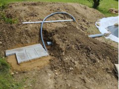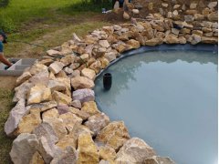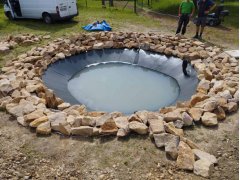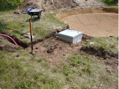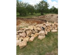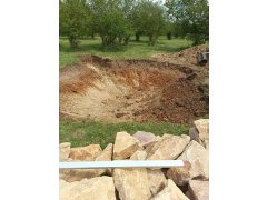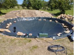 Toto jezírko uprostřed sadu jsme stavili na klíč jako překvapení pro partnerku. Začali jsme vytyčením tvaru jezírka a následně vybagrováním. Poté se ručně dotvarovali pobřežní zóny a dočistili hrany. Vykopal se základ pro čerpadlovou šachtu, vybetonoval se podklad, aby se šachta pod tíhou vody nepropadala. Na dno jezírka se položila gule, od ní se natáhlo potrubí k čerpadlové šachtě, stejně se postupovalo se skimmerem Oase Aquaskim Gravity, tam se připravila na stěnu fóliová příruba 110mm a od ní se opět vedlo potrubí k čerpadlové šachtě. Po těchto úpravách se celé jezírko pokrylo kopaným pískem, na něj se položila geotextílie 500g a pak se začala pokládat jezírková fólie Fatra Aquaplast 805/V olivově zelená. Když bylo vyfóliováno, položili se na pobřežní zóny kameny Kubo a zasadili květiny. Zatím co se napouštěla voda, technici zapojovali technologii. Vzhledem k místu a požadavkům na nenáročnost obsluhy jsme zvolili filtr Oase BioTec ScreenMatic2 90000 na něj jsme pověsili UV lampu Oase Bitron C 55W. Do čerpadlové šachty jsme zapojili čerpadlo AquaForte O-series 16000, které čerpá vodu z čerpadlové šachty do filtrace odkud následně vytéká čistá voda zpět do jezírka samospádem.