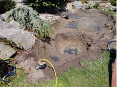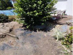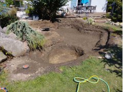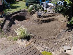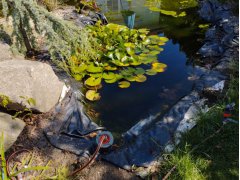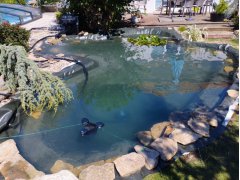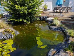 Rekonstrukce tohoto jezírka na klíč probíhala velmi rychle….klient se s žádostí o rekonstrukci trefil do zrovna uvolněného okna v našem kalendáři. Muselo se vše ale velmi rychle domluvit a začít s pracemi. Již za pár dní byl jasný plán prací. Jezírko se muselo vypustit, vylovit ryby, odstranit a uchovat vodní květiny…hlavně lekníny a zlikvidovat starou fólii. Poté se ručně upravil tvar jezírka, prohloubilo se a upravili se pobřežní zóny. Následně se na celý povrch dal kopaný písek, na který se položila geotextílie 500g na kterou se začala navařovat jezírková fólie Fatra Aquaplast 805/V olivově zelená. Po dokončení se mohli dát do pobřežních zón kameny Kubo a zasadit květiny. Hned poté se mohla začít napouštět voda. Technologii jsme zvolili jednoduchou na obsluhu filtr Oase BioSmart Screenmatic2 90000 na něj jsme pověsili UV lampu Oase Bitron C 55W a na dno jezírka jsme dali čerpadlo Jebao ECO FTP 10000, tento systém, jednoduchý na ovládání udrží vodu v jezírku krásně čistou celou sezónu.