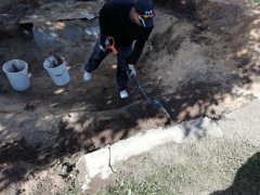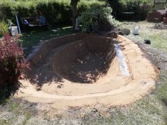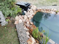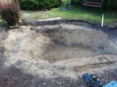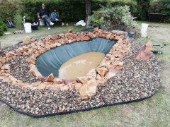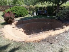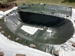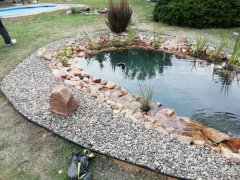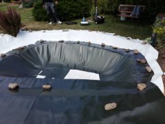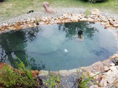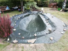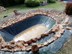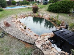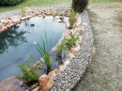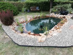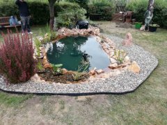 Na začátku prázdnin jsme začali s rekonstrukcí malého okrasného jezírka na chalupě u Žatce. Když jsme přijeli na místo bylo to malé, zarostlé nefunkční jezírko. Nejprve jsme vyčerpali vodu a odstranili starou fólii. Odkryté dno se zarovnalo, upravil se povrch do požadovaného tvaru a pokrylo kopaným pískem. Poté se začalo s pokládkou geotextílie 500g a na ní se ihned svařovala jezírková fólie, Fatra Aquaplast 805/V olivově zelená, dle tvaru jezírka. Po vyfóliování se ihned začala napouštět voda. Mezi tím se přivezli větší kameny a kačírek, okrasné okraje jezírka se vyhranili neviditelnými obrubníky. Do pobřežní zóny se usadili větší kameny a dosypali se menším kačírkem, zasadili se vybrané vodní květiny.
